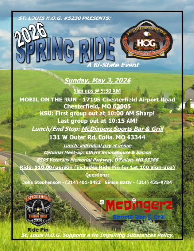 Join us for Challenge Ride #2, The Spring Ride! Sign-up at Mobile on The Run at 9:30AM, pre-ride meeting at 9:45AM, KSU - First group out at 10:00AM! We're headed along a fabulous back road to route to McDingerz Sports Bar & Grill in Eolia, MO.
