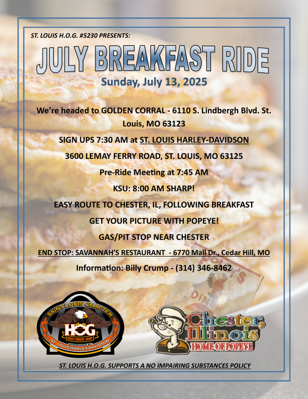 Sign-up at St. Louis Harley-Davidson @ 7:30 AM, KSU @ 8:00 AM SHARP! Short ride to breakfast at GOLDEN CORRAL - 6110 S. Lindbergh Blvd., followed by a ride to Chester, IL. End Stop - Savannah's in Cedar Hill.